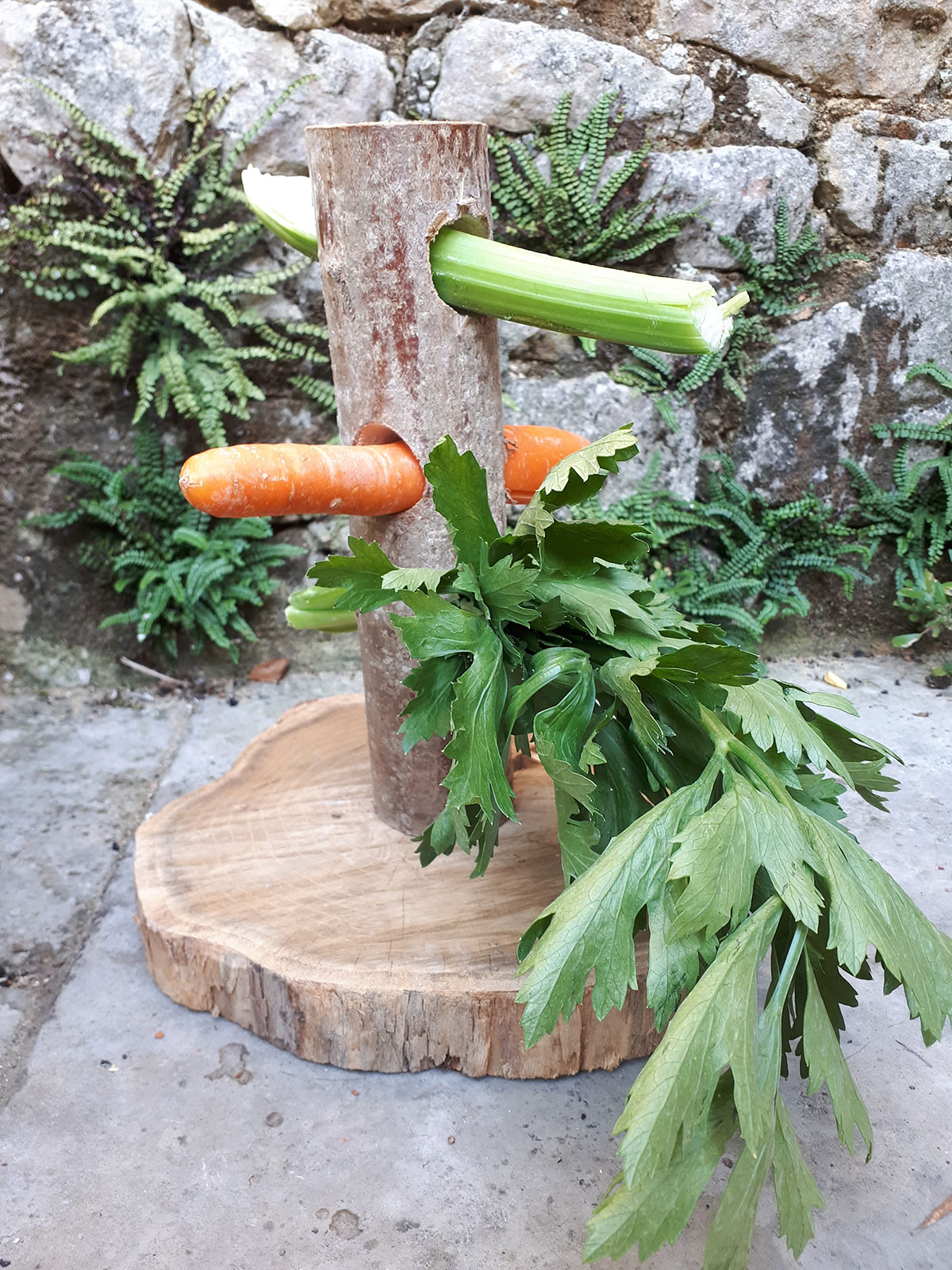 Les parents de lapins se demandent souvent où mettre la verdure et comment la présenter. L’arbre à nourriture est un accessoire super sympa qui permettra de varier un peu les plaisirs dans la manière de s’alimenter.
